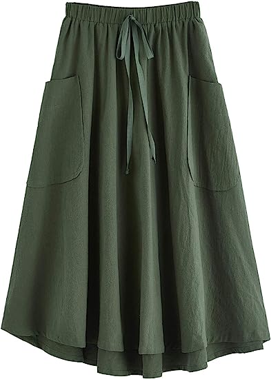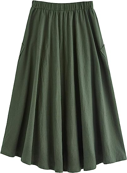 Women's Casual High Waist Pleated A-Line Midi Skirt with Pocket